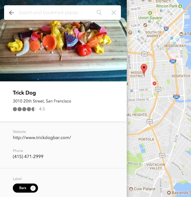 Travel smarter by saving the places you want to go. This project was an assignment given for an interview. The requirements were to build a web-app that calls the Google Places API. It must include a map with pins and a list of locations, with some interactivity between the two.